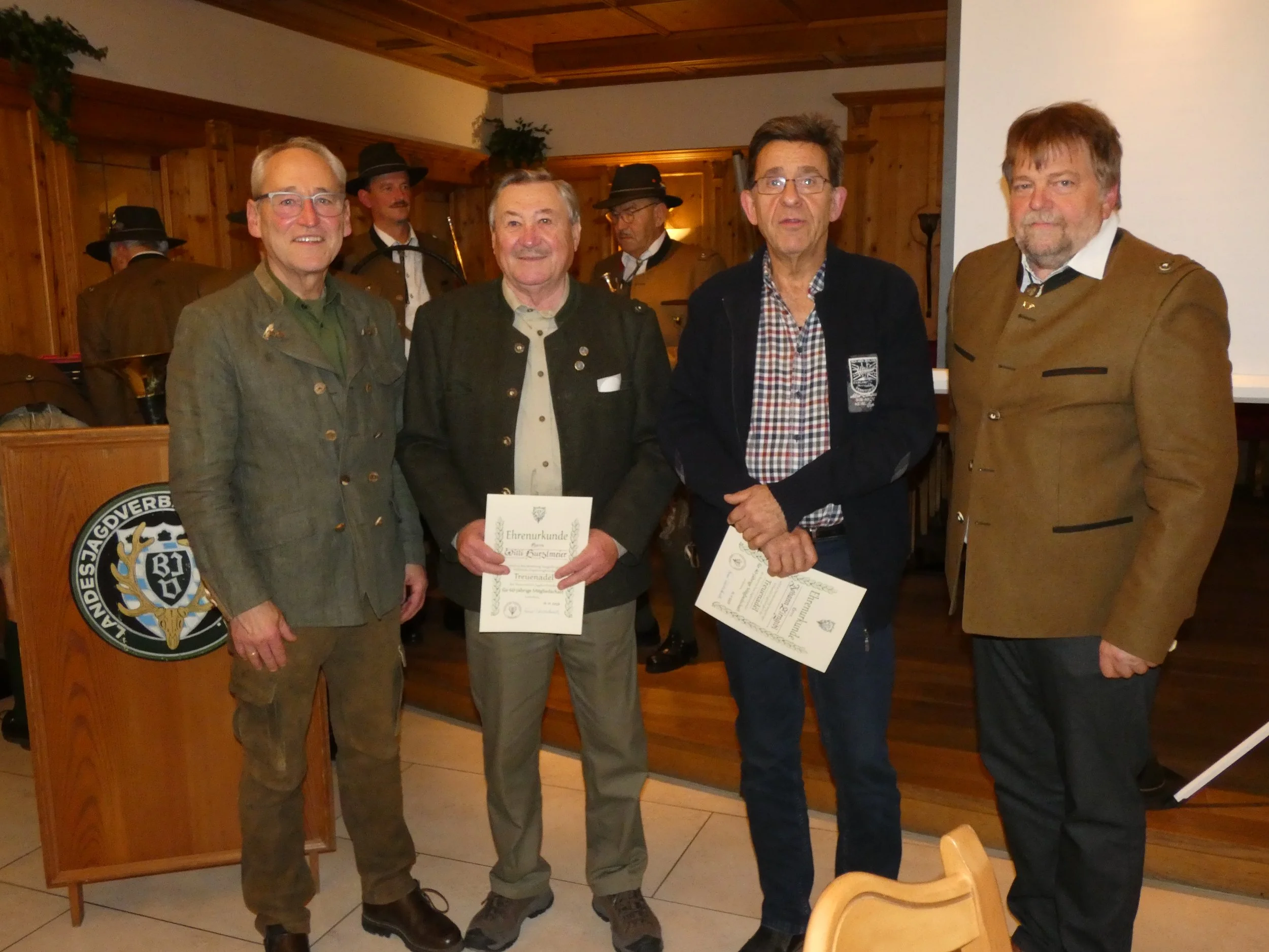 Die beiden Vorsitzenden Arthur Bauer (links) und Dr. Konrad Schmalhofer (rechts) konnten an Willi Hurzlmeier (2. v. l.) die Ehrenurkunde für 60 Jahre und an Hans Zirngibl (2.v. r.) die Dankurkunde für 40 Jahre Mitgliedschaft beim BJV überreichen.